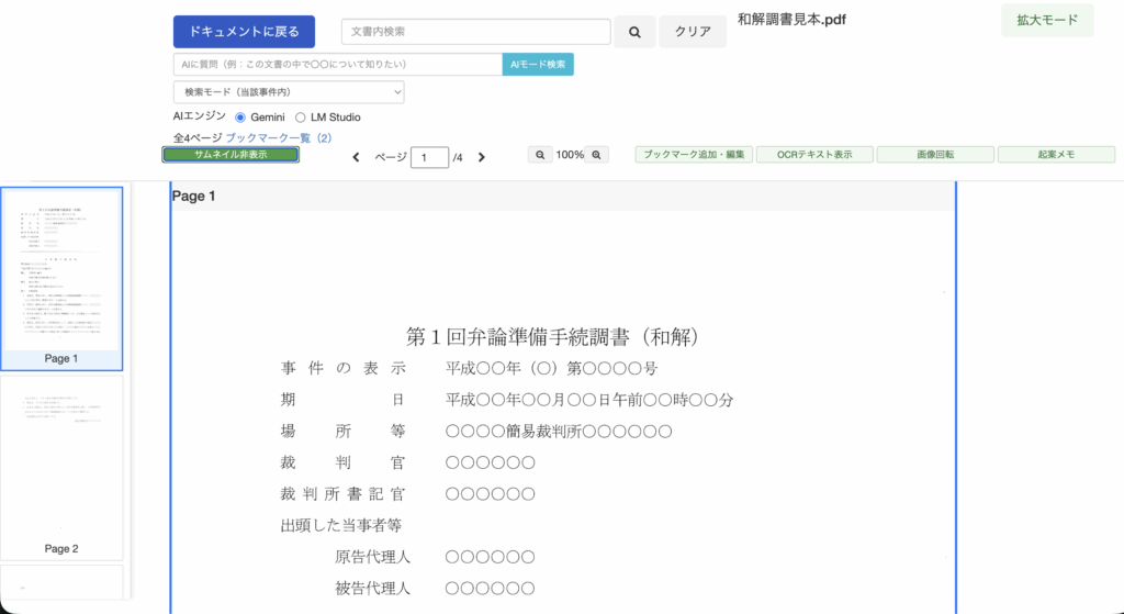 例えば、証人尋問の準備を行う際に「誰がどの記録で何を言っていたか」を一瞬で検索できます。検索結果から直接そのページを表示できるため、「記録を探す」作業を大幅に短縮できます。