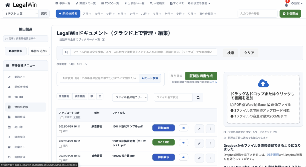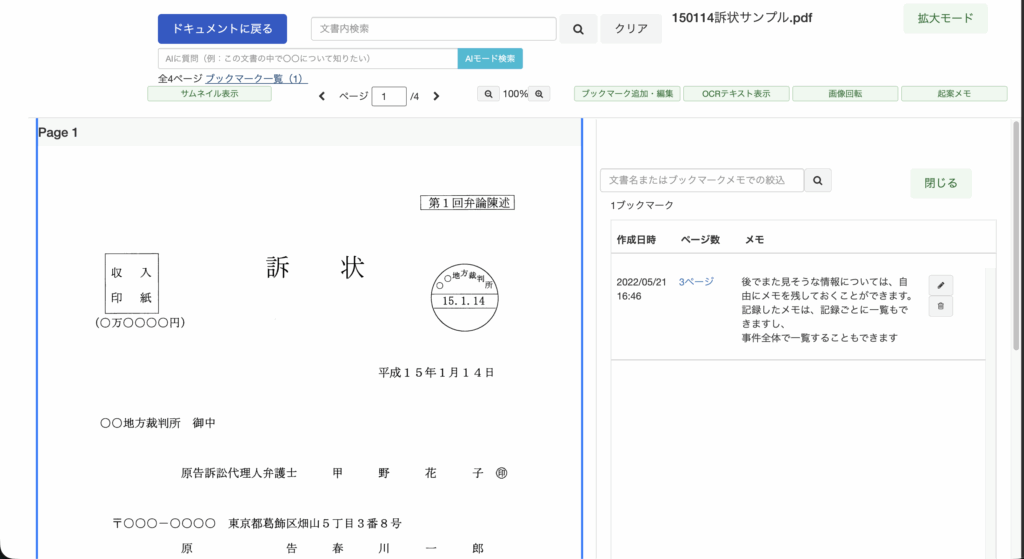 OCR処理済みのファイルは、キーワードで全文検索できるようになります。1つの事件内はもちろん、複数のファイルを横断して検索が可能。何万ページの記録があっても、瞬時に該当箇所を見つけられます。