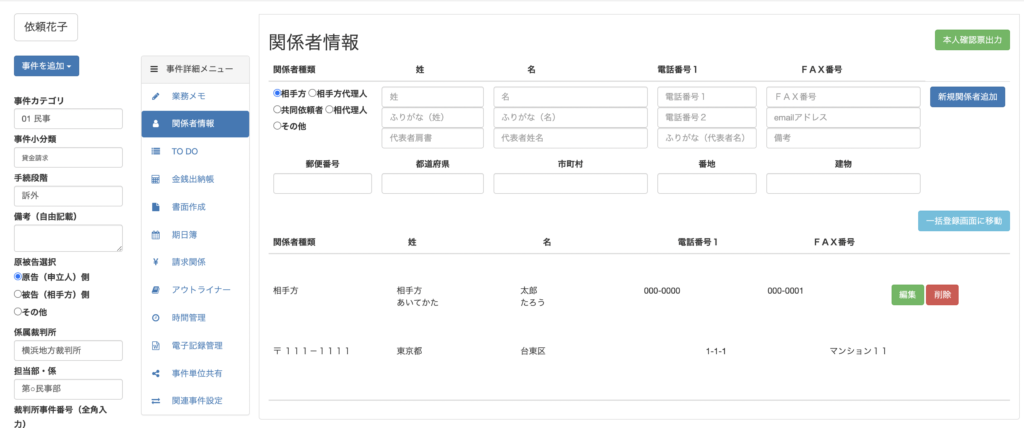 事件詳細メニューの中の「関係者情報」タブを選択すると、相手方や相手方代理人などの事件についての関係者の情報を入力する画面に移動します。